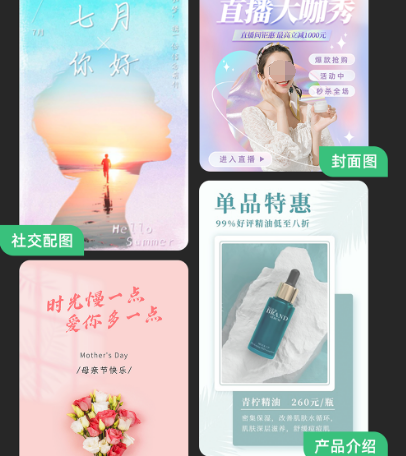 设计神器轻松出图几十万原创模板,更换图片以及文字之后,只需几分钟即可快速完成,没有太多的学习成本,更不需要有专业的设计经验,操作便捷轻松编辑。正版资源可直接在线套用,直管设计,平台负责版权问题,完全不用担心有侵权的现象。上百种不同的尺寸解决所有涉及作图需求,包括长图、封面、名片、手抄报、微信封面等等。