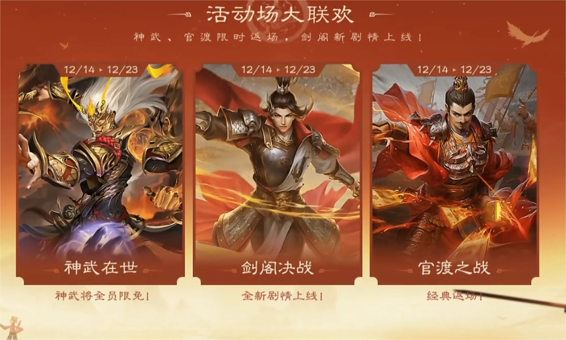 再就是周年庆开启的这段时间附近也会推出“活动场大联欢”,其中神武和官渡都会在14~23号期间限时返场,而新增的剑阁决战则会附带新的剧情呈现给玩家们。