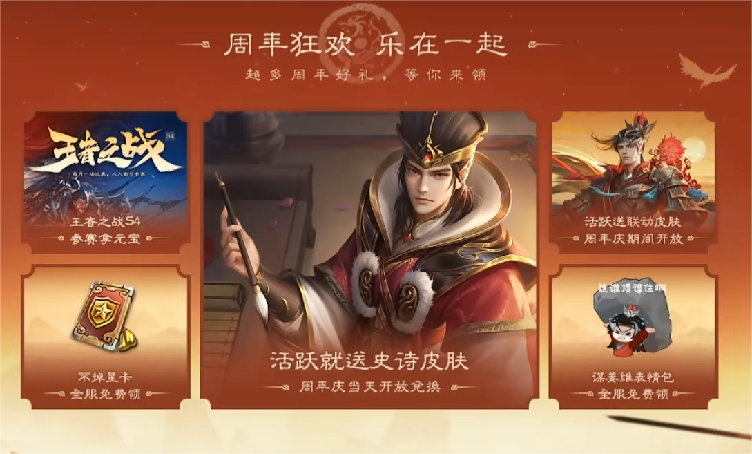 最后还有一些比较杂的周年福利也可以在周年庆开启后领取,其中包括参赛拿元宝的王者之战,还有免费领取的不掉星卡,以及周年庆期间通过活跃度来领取的史诗皮肤和联动皮肤,以及全服皆可免费领取的谋姜维表情包。