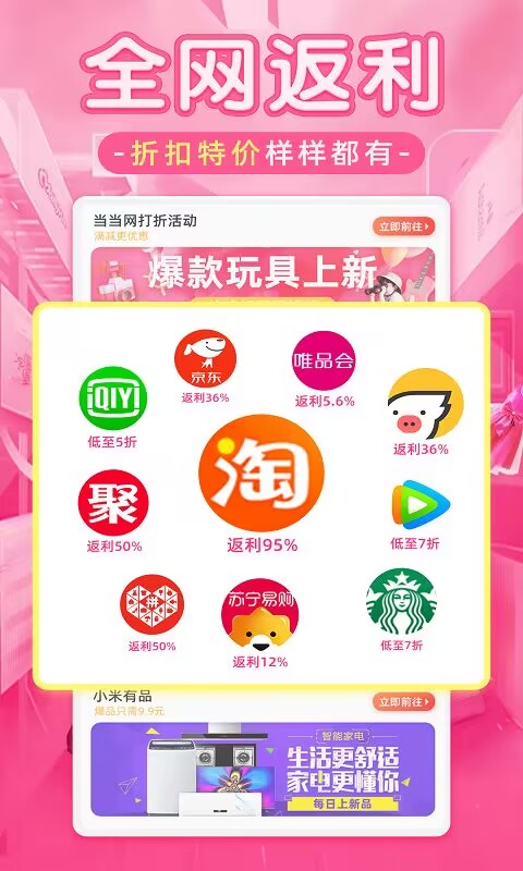 淘优品返利日记这款软件是一款能够让我们购物省钱省力的App软件,借助这款软件我们能够找到超多优惠的折扣,例如外卖电影票以及购物平台的返利折扣优惠券,这样的话各位用户们购物就会体验更加优惠的价格。