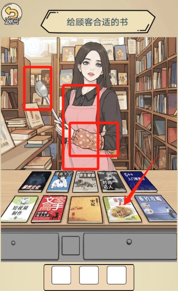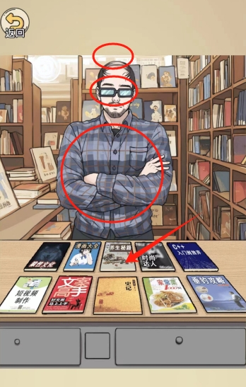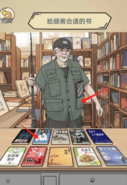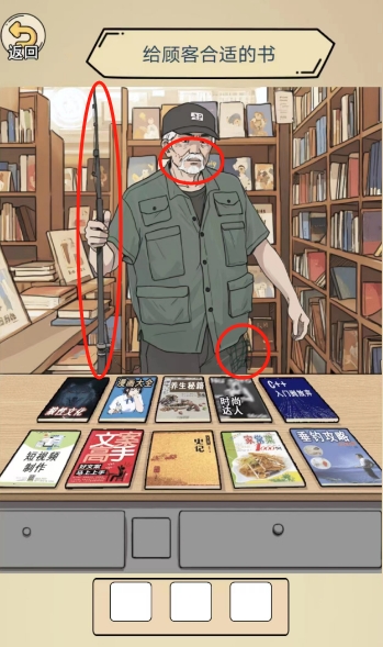 第三位顾客从形象是来看似乎是一个喜欢钓鱼的老头,但实质上这只是表象,因为他在到来的时候会提到自己是给孙子买书的,这里需要先点击鱼竿,渔网和白胡子作为表面的判断依据。