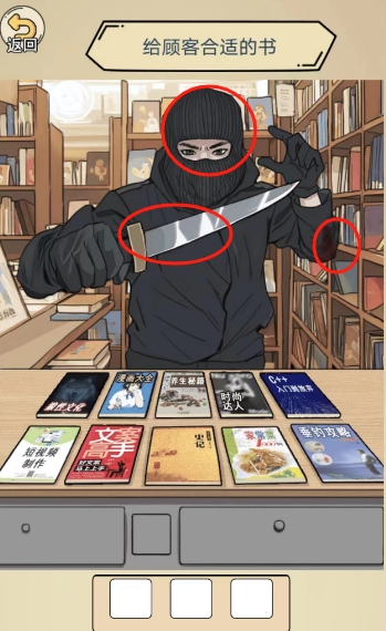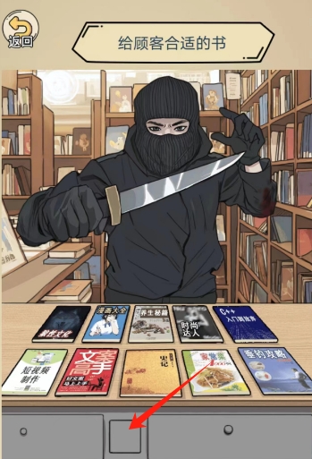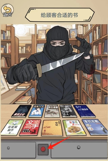 凑齐之后你并不能直接拿书给他,因为他的目的是抢劫,所以这时就需要拖动桌子下面中间的这个暗格,然后就可以看见中间的红色按钮,按下后就可以报警抓住他了!