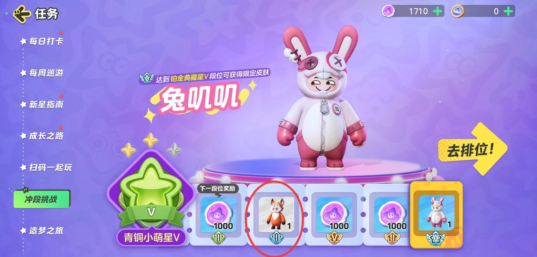 而冲段的话就只能进行排位派对战了,左上方改变游戏模式,调整成排位模式。有单人模式和组队模式两种选择。完成排位赛任务,提升你的元梦排位赛积分和段位,解锁元梦之星排位赛奖励。达到白银三之后再在排位赛奖励中,找到小红狐皮肤的各个部件,点击领取。背包选中小红狐皮肤,点击装备,即可穿上小红狐皮肤。