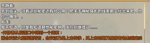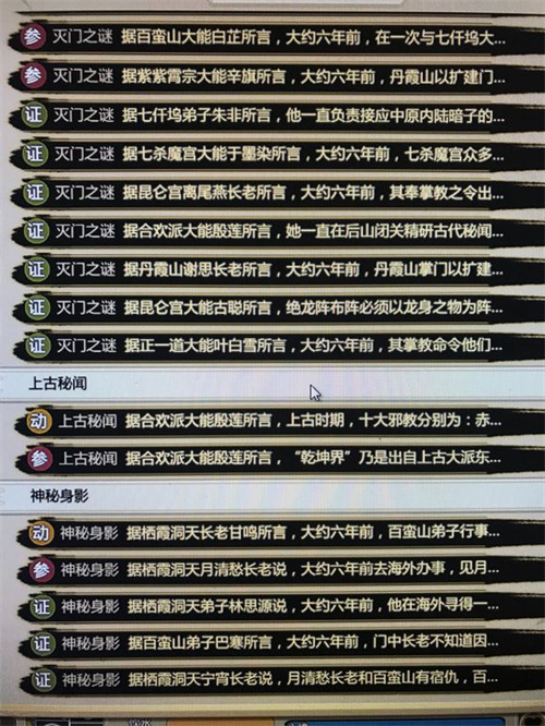 然后在各个门派找神秘身影的线索,推断出灭门之谜里各个人物的角色。灭门之谜就是百蛮山想要抢太一门的乾坤界,跟其他七个门派一起对太一门发起了灭门之战,但是最后乾坤界的去向却不得而知。