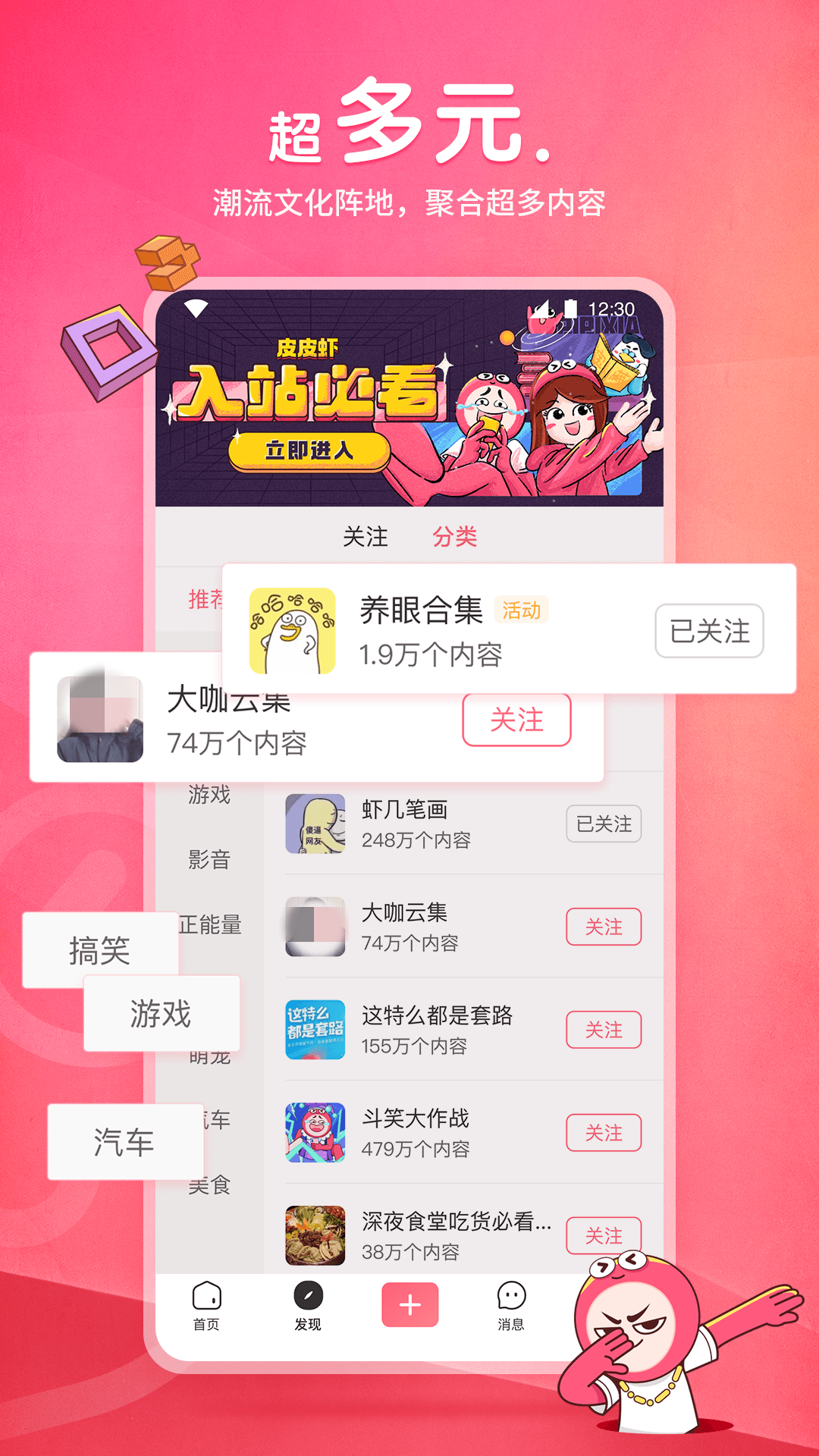 深受年轻人喜爱的社区型软件,这里有很多不同分类,总可以找到适合自己的那一款。里面推出的内容都是高质量精彩视频,既可以让大家放声大笑,又可以直指心灵最深处。还有专属于皮皮虾的搞笑表情和动态图片等。