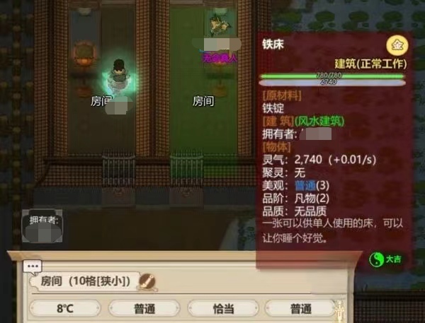 还有就是当中角色们睡觉的房间床了,床在游戏当中就是一个风水建筑,床所展现的位置如果是大吉也是可以的,游戏当中各种装饰品还有建筑物的位置方位都是需要玩家们注意的点,注意他们的方位位置合理安排后期修仙道路会顺畅许多。