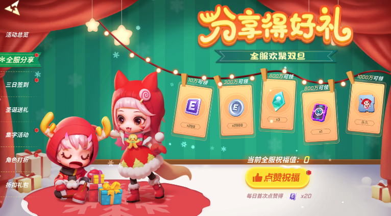第一阶段的活动主要有以下几种:全服分享:登录游戏进行签到,即可领取丰富的资源奖励和限定的涂鸦。这是最简单的活动,只要每天登录游戏,就能轻松获得奖励,不要错过哦。三日签:进行签到就能领取圣诞主题头像框。只有在12月23日至30之间,连续签到三天才能获得这个头像框,所以要注意不要断签哦。圣诞送礼:在游戏中送出或收到新的圣诞礼物,这个礼包中能领取全新的圣诞主题像框。这个获取条件是在游戏商城中购买圣诞礼物,或者在游戏中获得圣诞礼物,然后在游戏大厅或者游戏结束后,选择你想要送礼的玩家,点击送礼按钮,就可以送出礼物了。当然我们也可以在逃跑吧少年大厅或者游戏结束后,点击收礼按钮,查看你收到的礼物。每送出或收到一次礼物,就可以领取一次奖励,最多可以领取三次。这个活动可以和三日签到活动一起完成,因为送出或收到的礼物也会算作签到的条件。