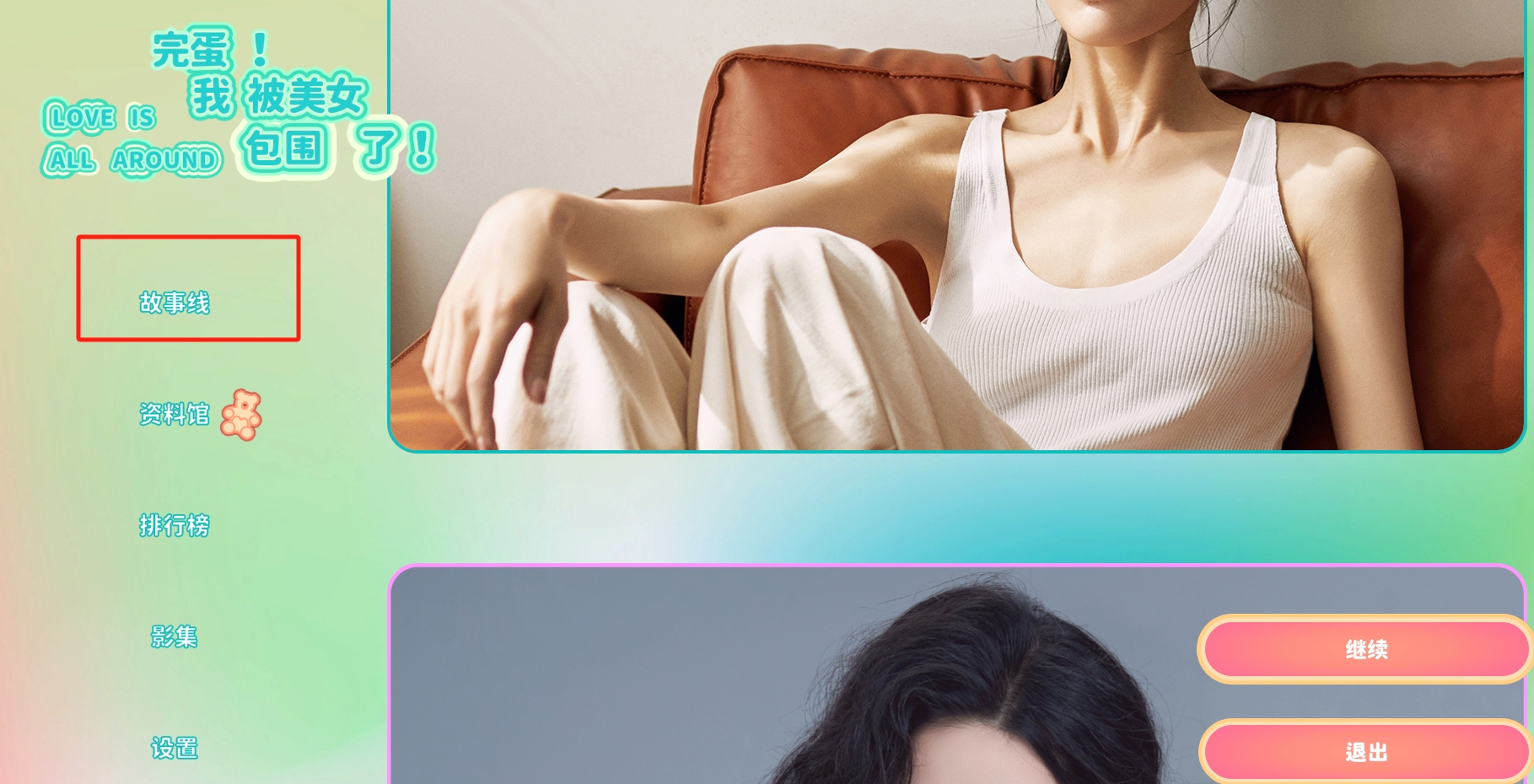 进入游戏后,你会来到如下图所示的这个页面,一般自己顺着玩的话都只会点击右下角的开始或者继续,之前有进度的话右下角就只有继续和退出两个选项,所以要重新开始的话得前往左边的“故事线”选项里。