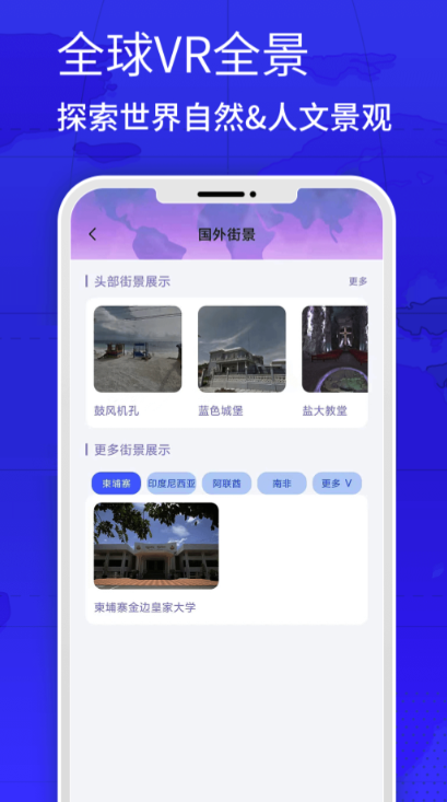 软件带有vr实景效果图,让你足不出户就可以看到全世界最美丽的风景,不管是底蕴富有的古城还是充满浪漫的海滩,只要是你想看到的都是可以简单的搜索定位的。