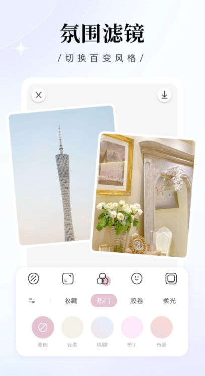 多功能的氛围滤镜让大家的照片更加的精美,各种不同的尺寸随意可以剪裁,没有限制操作,从而也不会遇到广告的打扰,满足大家一站式修图的需求。