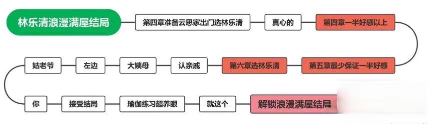 再来就是另外一个好感度的结局,这里的结局有个名字叫做浪漫满屋,想接触这个结局那么玩家们首先要做的就是让林乐清的好感度保持在一半以上,然后再去认亲戚,这里的认亲顺序是先认大姨母再认大姑再认姑姥爷,然后玩家们要在表白的时候触发求婚剧情,这样的话林乐清的好感度就会直线上升,过这一结局的时候好感度只要有一半就好。