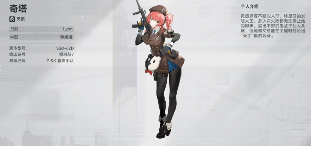mp7——奇塔是一位拥有奇思妙想的人形,型号为SSD-62D,烙印就是mp7。她的作战能力毋庸置疑,但她的“天才”般的想法和战术,往往会给她带来麻烦。她的梦想是更换素体,成为更强的人形,所以她总是努力地寻找各种机会和挑战。
