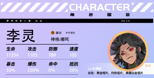 哪吒在游戏中也就是李灵,新手保底的时候很容易获取,在游戏中其实在大家输出角色不多的时候是可以先用哪吒的,在之前的版本中哪吒也有被削弱一点,攻击数值想要更高一点的话需要提升暴击几率以及自己的速度。