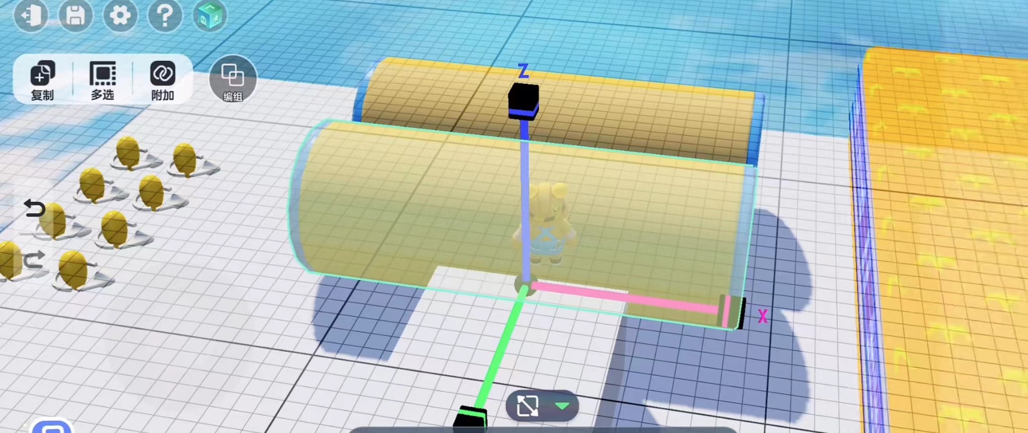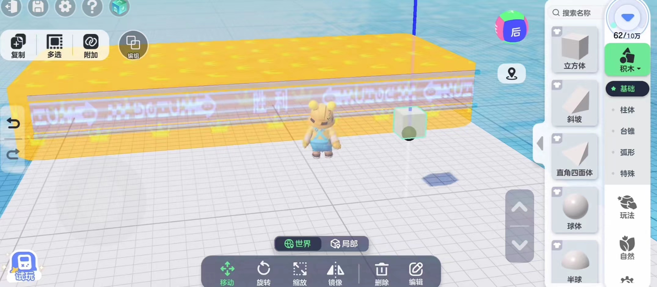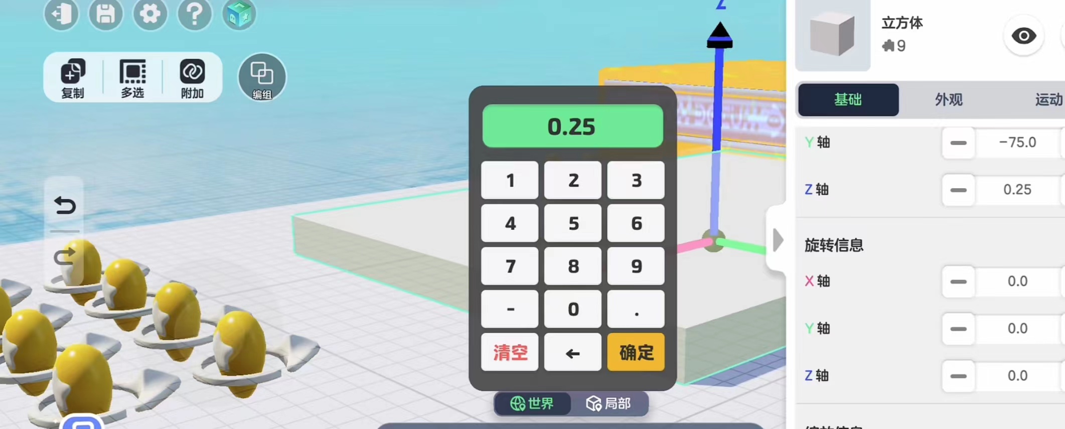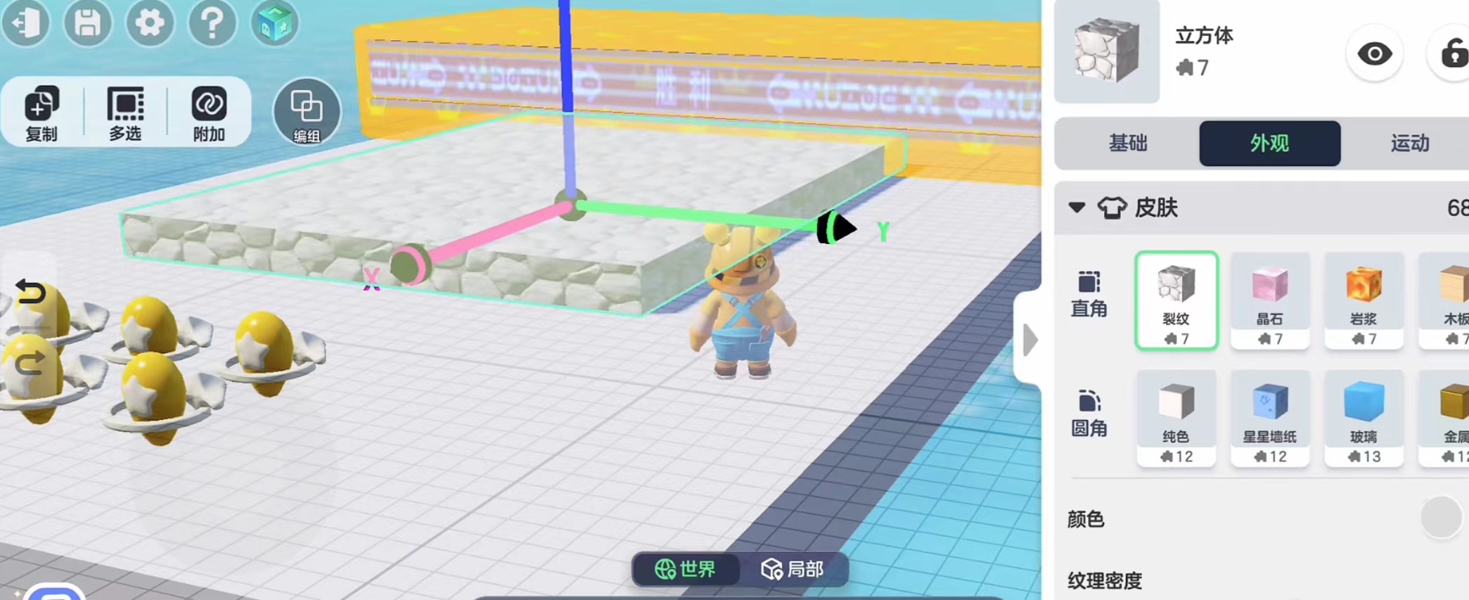 那么要怎么改变物体颜色呢?这就需要用到界面下面的工具栏了,在这里有移动缩放镜像以及删除和编辑这五个功能,前面四个都是十分简单的,玩家只需要按照自己的想法改变物体的位置和大小就可以了。想要改变物体的颜色就需要用到编辑,打开编辑界面我们会看到有基础,外观以及运动三个栏目,我们选择外观这一栏就可以改变物体的外观以及颜色了。基础界面玩家可以根据自己的想法去调整物体的数值,而且还可以多个相同物体一起调整,十分的实用方便。