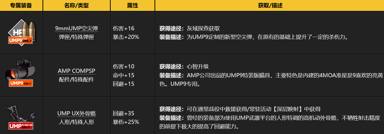 ump莱娜的装备位可以装备芯片、外骨骼,弹匣位可以装备状态弹,配件位可以装备光学瞄具、全息瞄具、红点瞄具、夜战装备、消音器。芯片:攻击力芯片、射速芯片、命中芯片、回避芯片。这些芯片可以进一步提升ump莱娜的输出能力和生存能力,使她在战斗中更加优秀。外骨骼:ump外骨骼、高机动外骨骼、高性能外骨骼。这些外骨骼可以增加ump莱娜的移动速度和攻击力,让她的技能更加强大。状态弹:穿甲弹、燃烧弹、冰冻弹、电击弹。这些状态弹可以给予敌人不同的负面效果,如降低防御、造成持续伤害、减速、眩晕等,增加ump莱娜的控制能力和杀伤力。