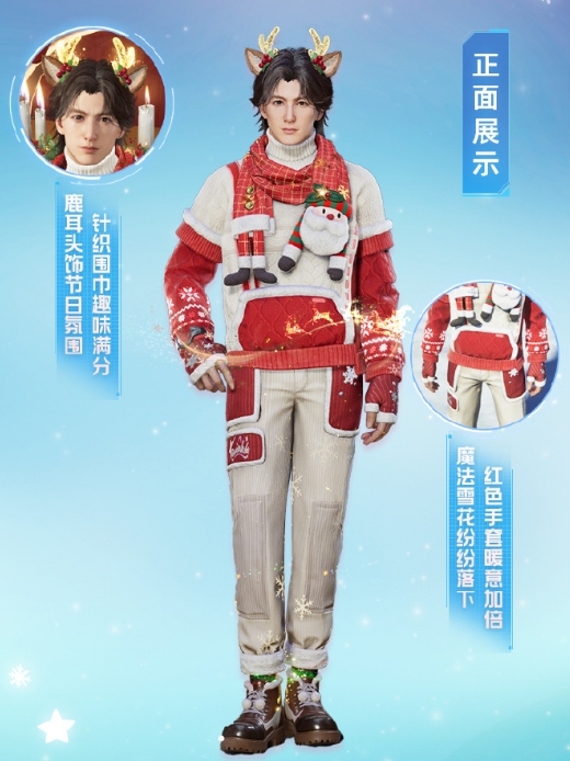 男性角色用的是一样色调搭配的服装,上身的毛衣以白色跟红色为主,脖子上有一条红色格子围巾,围巾上面加入了圣诞老人的元素,手上还有一个红色的半指手套,搭配白色的裤装以及深色的靴子,跟女性服装同款的头饰看起来更加帅气,两者都是很符合节氛围的哦。