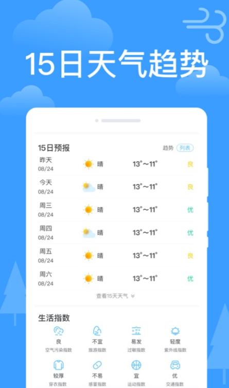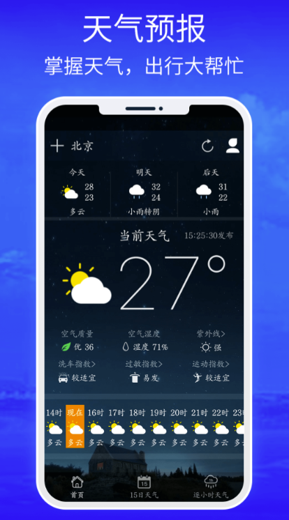 简约大气的设定方便大家的使用和操作,多样化的天气图标,可以将各种不同的天气状况为大家呈现出来,精准的空气质量指数帮助大家很好的保护身体健康。