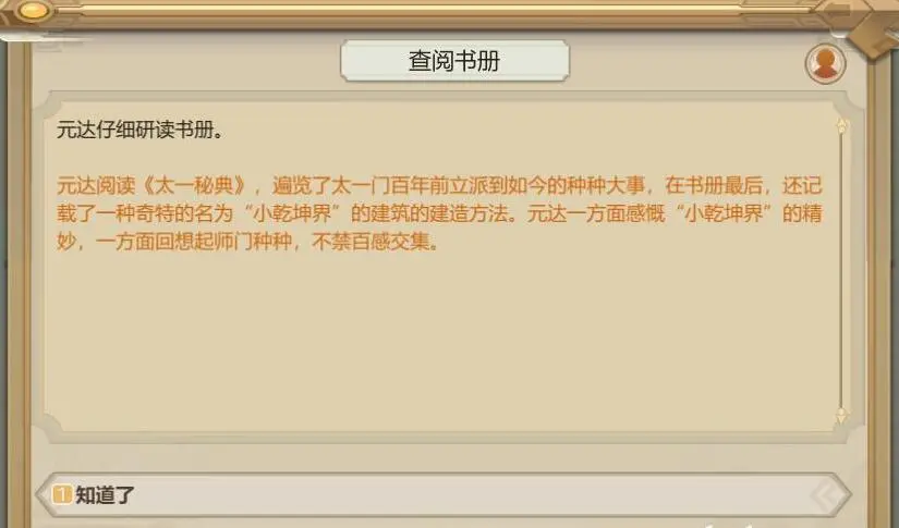 在完成这个任务之后就可以获得五本功法等等道具了,随后重回太一完会刷出一个太一遗迹,大家可以派出一个人物进入到塔当中,其中会有小乾坤界的建造方式和太一宝典,后续就需要大家继续解开剧情中的谜团了。