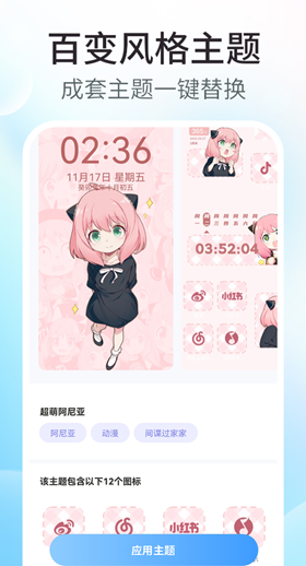 这款软件中主题的风格主要是以可爱风以及动漫类型的为主,除了可以一键替换掉锁屏、壁纸之外,软件还提供了众多logo样式以及小组件供大家选择使用,还是比较给力的。