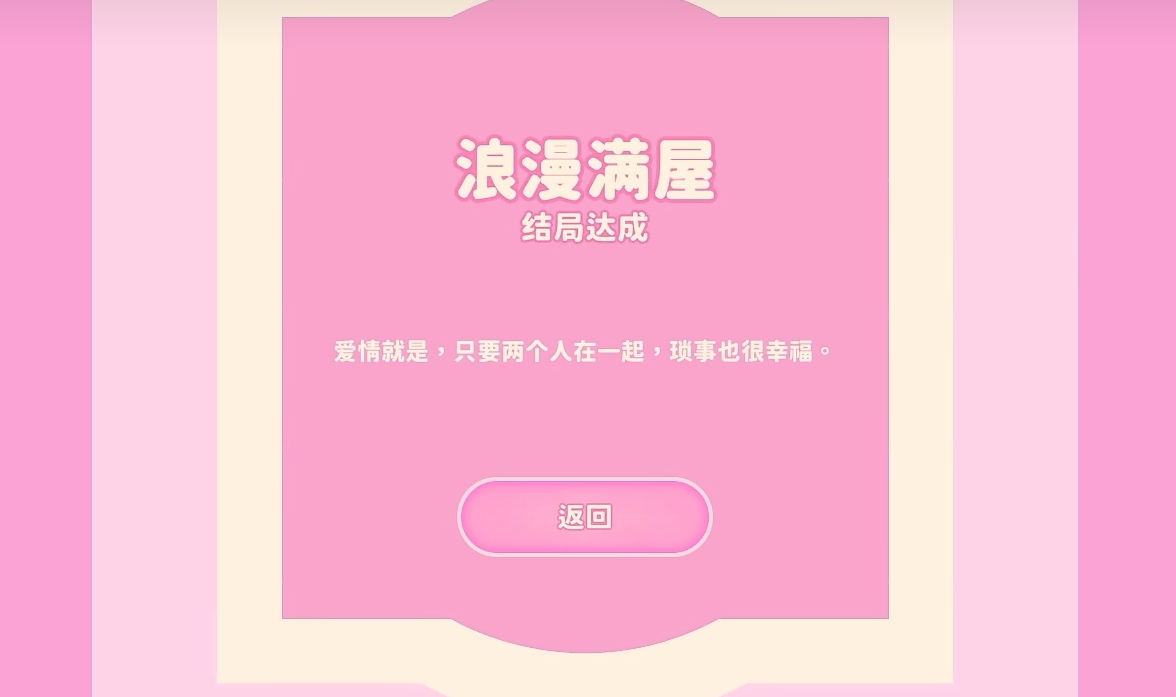 浪漫满屋:这是林乐清的完美结局,在最终抉择阶段选择林乐清之后答对她的所有问题,之后触发后续的瑜伽剧情,让她换五次动作之后即可触发,该结局算是最好的一个,你会成为浩浩的新爸爸,与林乐清一同经营这个家。