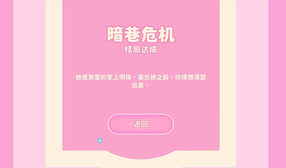 暗巷危机:它是林乐清的一个隐藏BE,该结局需要通过拉低林乐清的好感度来实现,同时在后续分支剧情出现的时候,选择不找林乐清而去找郑梓妍,这样在后面她的家人亲戚就会来找你并进行教训,教训完后主角会在医院醒来并触发该结局。