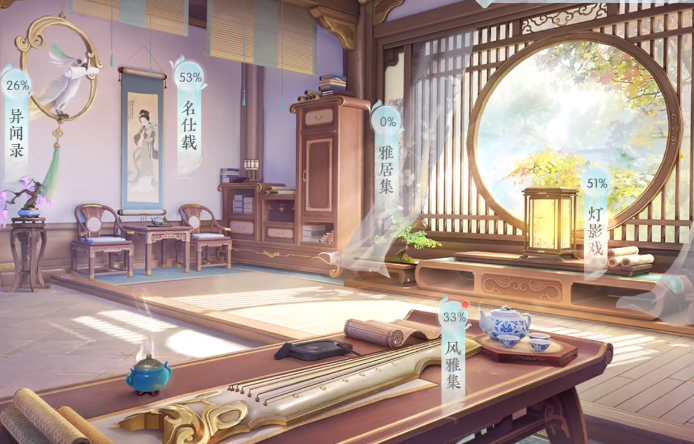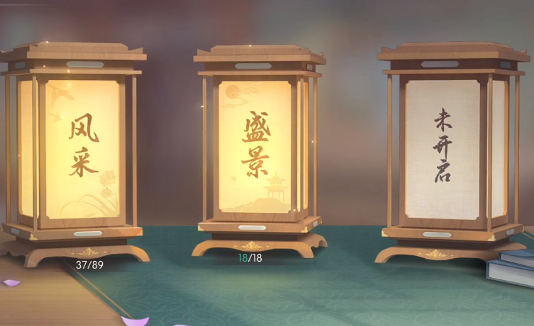 玩家可以在游戏中先寻找菜单选项,然后在菜单中会有一个绘卷的分类,点击了会券之后,玩家就会发现进入到了一个非常立体唯美的菜单选项中,在窗台下面会发现有一个亮着灯的灯笼,旁边写着皮影戏这个分类,玩家点击完这个分类之后就会发现现阶段有两个不同的类别,一个是风采,另外一个就是盛景,玩家只需要点击这里就可以欣赏游戏中的美丽景色。
