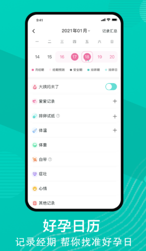 可以在其中自由记录姨妈、体温、体重等指标信息,系统会自动帮助我们测算易孕期、排卵期、姨妈期等,对于已经成功怀孕的小伙伴们来说也带有大量的孕期知识可以一键获取。