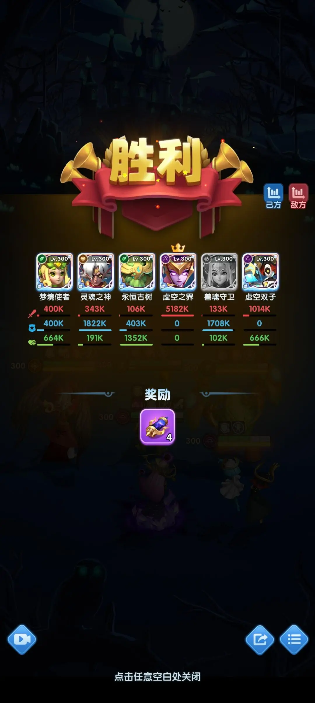 第四关敌人的强度进一步提升,所以这里需要进行变阵,推荐使用“梦境使者 灵魂之神 永恒古树 虚空之界 兽魂守卫 虚空双子”的搭配,这套阵容的功能性和控制能力会更强,其中梦境使者和灵魂之神都可以对敌人提供减益,从而降低它们的攻防表现,永恒古树和兽魂守卫则能很好的进行承伤,最后的虚空之界和虚空双子则可利用自身机制对敌人打出成吨输出。