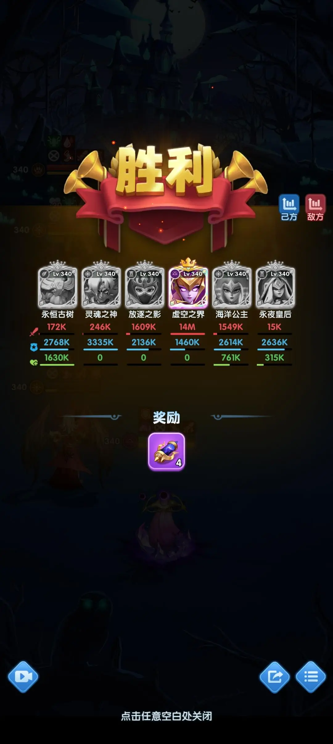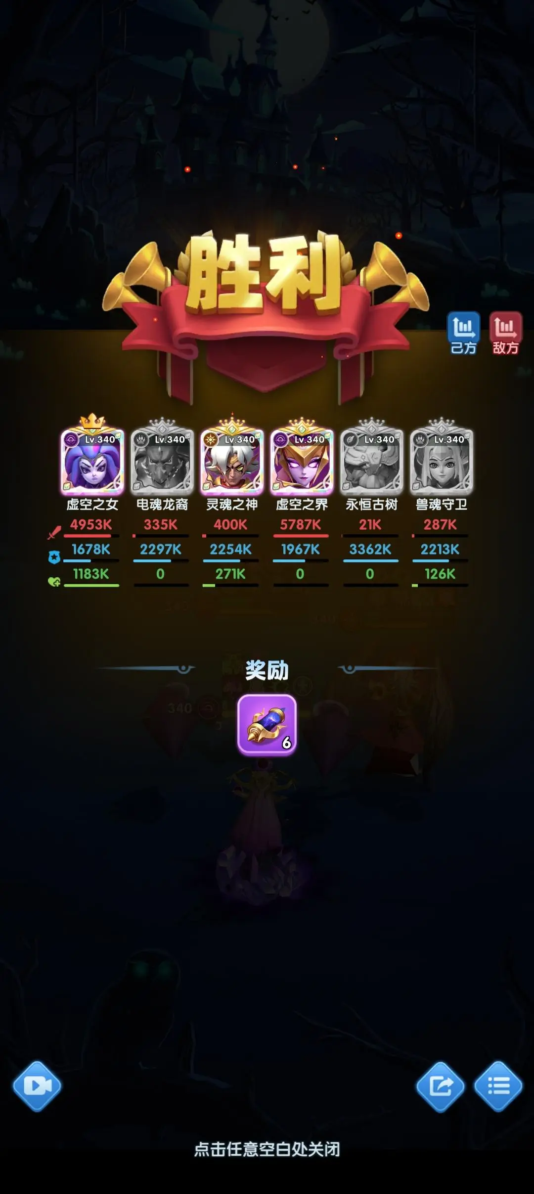 剩下的第五关则可以用“永恒古树 灵魂之神 放逐之影 虚空之界 海洋公主 永夜皇后”这一套,这套阵容的前排坦度和减益手段还是很足,换上的放逐之影和永夜皇后则增强了先手能力,海洋公主还有充能作用,让你队伍的爆发更快到来。