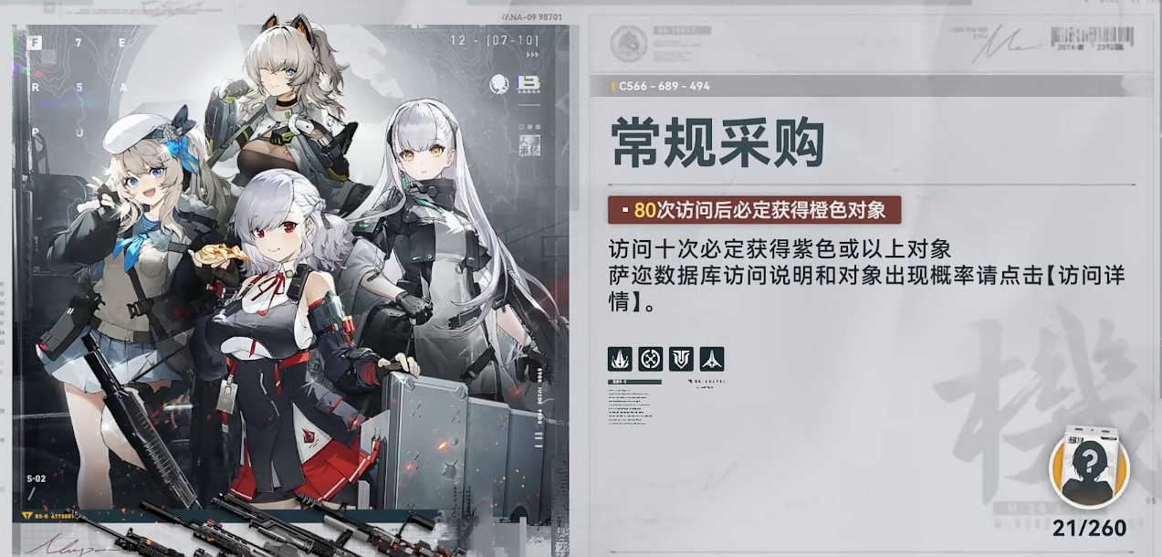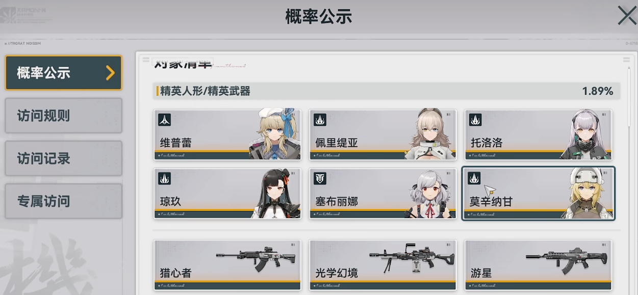 除了上述两种品质的人形/武器以外,玩家最常抽到的其实是蓝色的武器,当然,它里面十连抽都是有保底的,每十次至少能出一个标准人形/武器,然后连续58次没出精英,后续概率还会提升,精英的保底则是80次,当然,不管哪种情况出了精英,后续再抽它概率都会重置。