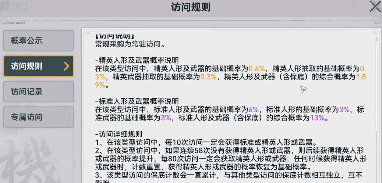 当然,精英品质已经是游戏中档次比较高的一种级别,更多时候大家还是抽的标准人形/武器,它包含保底的综合概率为13%,基础概率则为6%,人形和武器对半分的话则每样的出货率为3%。