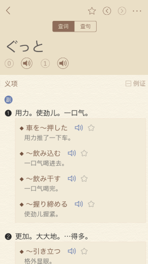 既然是学习语言怎么能没有词典呢,集成便捷的日语输入法让我们可以快速查询释义,带有的发音示例也很权威,更是可以完成中日转译,特别好用。