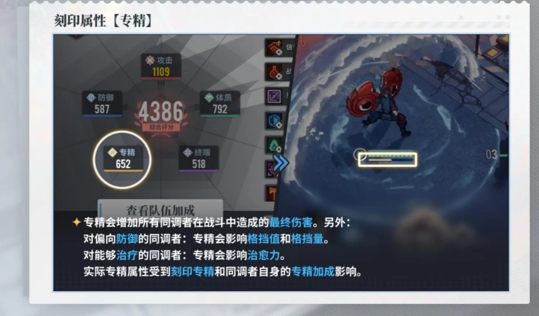 专精属性分为刻印专精和角色自身的专精,前者有一个通用的效果,那就是在战斗中增加所有同调者的伤害,这个增伤的效果是非常明显的,所以基本上你不管玩什么阵容都会需要去提升它。