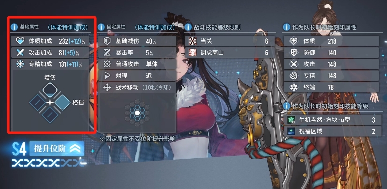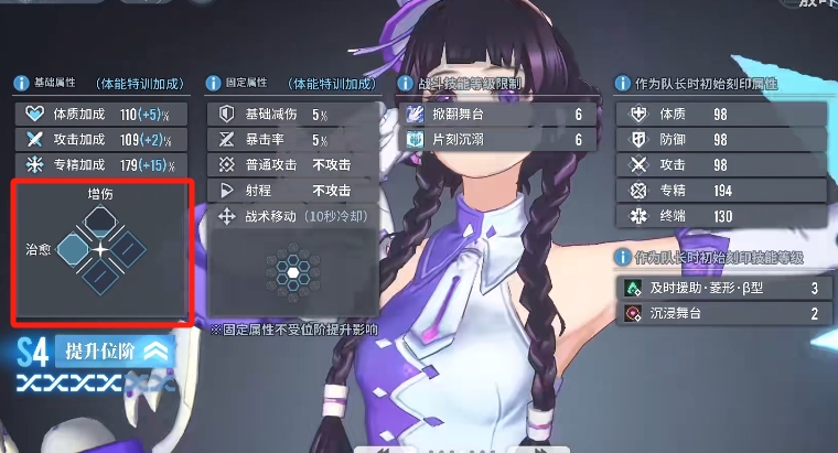 相比之下角色自身的专精会更加复杂一些,因为每个角色所擅长的方向都是不一样的,一般在专精加成下方都会有一个图形,这个图形中有亮色的区域就代表该角色的擅长项,比如下图这个角色她擅长治愈和增伤,那么在提升她的专精属性时,其治愈和增伤的效果就会进一步加强。
