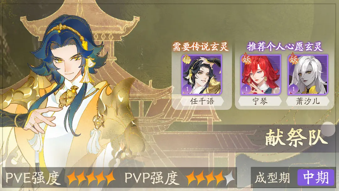 ③任千语 宁琴 青鸟 萧汐儿 韬:该阵容以任千语为主C,主打的是一个群伤爆发,因为该角色有着无视防御的AOE伤害手段,而且技能的加成倍率很高,放出技能后能显著压低对手血量,即使对手都是肉盾也难逃被快速清剿的命运。另外任千语和多位女性玄灵同时上阵后还会加快一技能的施法,因此爆发的频率得以变得更高,所以为其搭配宁琴,青鸟和萧汐儿是很好的选择,而且这三者分别可以提供保命,续航和输出增益,对于任千语的提升是十分全面的,最后再来一个韬补伤害并降低对手治疗,可以做到完美压制对手的反扑。