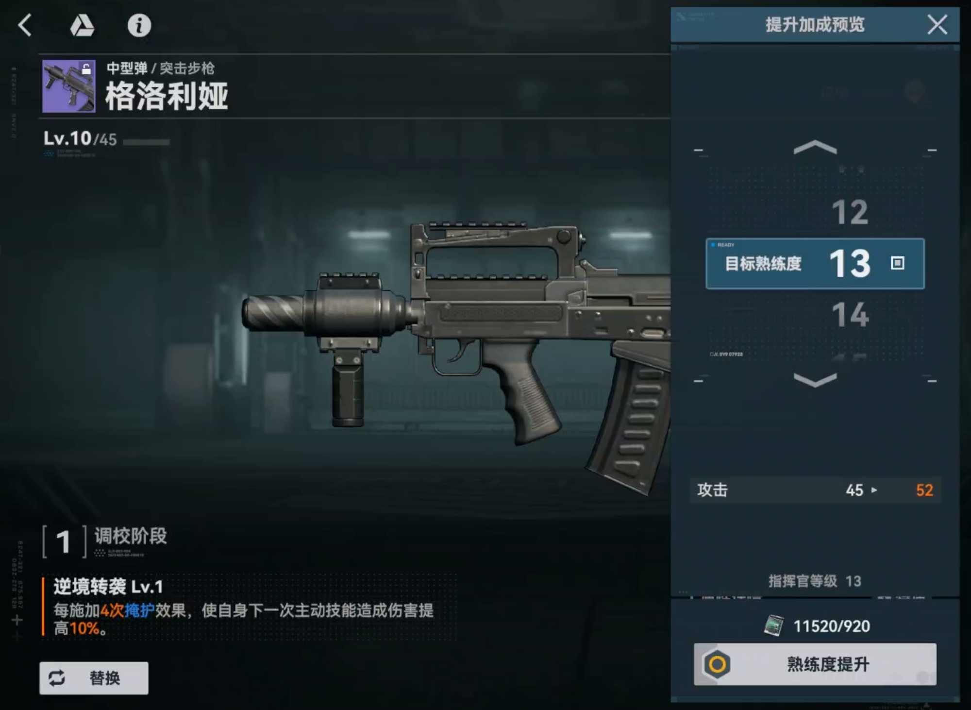 其次是武器练度提升,包括武器品质、武器等级、武器配件三方面。玩家需要先检查角色是否装备了最高品质的合适武器,然后像提高角色等级那样,将武器等级升到最高,以此来提升角色的输出。而配件会在玩家23级时解锁,玩家可根据每位角色的定位,为她刷取一套套装词条合适的配件,若金色配件不足可拿紫色过渡。