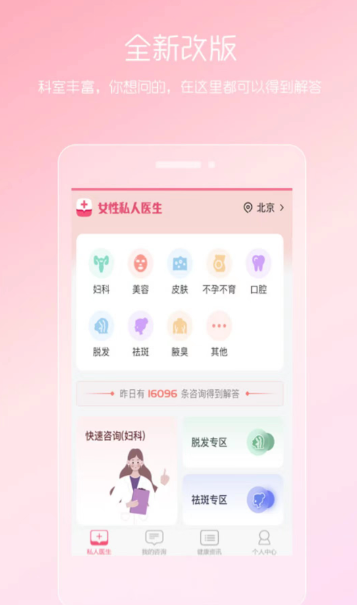 这是一款专门为女性用户提供的免费医疗健康咨询服务,上面有着各种医院的不同科室,不同病症,然后进行分类的咨询。通过自己的问题,然后来给你提供最专业的健康咨询服务。上面有各种可以记录自己健康的功能,让自己更加的健康。而且特别的安全便捷,都是特别的隐私。