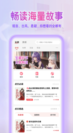 这款平台主要是以古风、现代言情、悬疑推理等类型的作品为主,收录在必读榜中的小说都是广受好评的优质之作,值得我们细细品味一番。