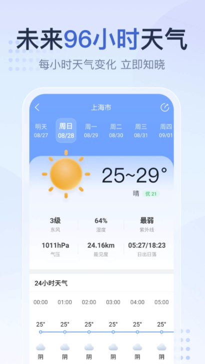 有了这这款软件可以方便大家随时随地查询当下所在城市的天气情况,每小时的天气变化也有着精准的推送,未来一周的天气分分钟就可以了解,为大家的出门提供更多的准备。