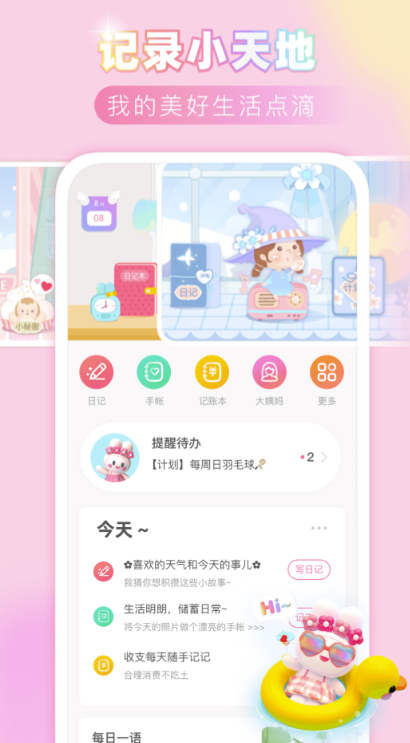 软件的主题真的是超级的治愈,慢慢的少女心特别的适合女孩子使用,通过自己的编辑将日常的零零碎碎记录到手机里边,恋爱的开始日期,各种约会的地点,还有甜蜜的日子等。