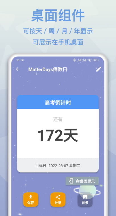 手机专业的倒计时应用软件,这里的功能划分的十分清晰,操作起来也很是顺手,按照年月日的计量单位显示出来,大家可以根据自己的需求进行选择和设定。