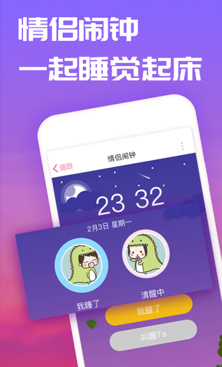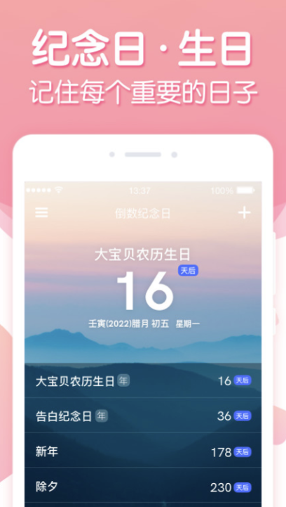 非常有特色的手机应用软件,自定义的添加两个人的纪念日,进入到倒计时的周期是可以进行时候死提醒的,自带的闹钟功能可以根据自己喜欢的音乐进行设置。