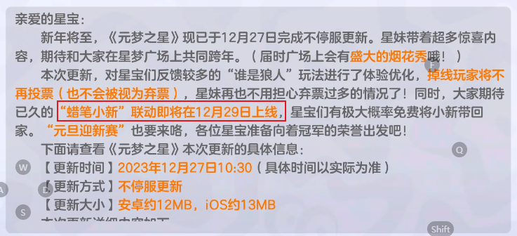 小编查阅了很多消息,这次小爱的皮肤和小新的三款不同时装都会在2023年12月29号上线游戏活动中,其中还有同款语音以及待机动作会免费赠送,而且还会开放性的限时祈愿池,玩家们可以在游戏中使用幸运币来抽取正版联动的超级龙虾-小新皮肤和动感超人-小新!