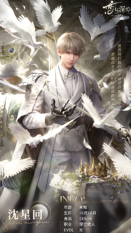 沈星回这个角色在游戏中是一个非常重要的角色,也是玩家们在游戏中遇到的第一个男主,还是比较有意思的,在游戏中,沈星回的年纪是23岁,是三位男主中年纪最小的一个,但是战斗力却不容小视,在未来星球中属于深空猎人,在游戏中数与月供攻击属性比较高的职业,初次见面,一头银灰色的短发就非常的吸引人,而且由于职业的问题,沈星回给玩家们的感觉就是非常神秘;而且自身的属性真的是比较特殊的,是光属性,通过后期的剧情接触,会发现沈星回是一个非常温柔的男主!而且会在女主遇到危险的时候,使用资料技能来帮助主控,所以当玩家们在和沈星回搭配战斗的时候,就会比较轻松,沈星回的技能可以在指定的位置释放出一个治疗光圈,站在光圈光圈中,不断的去移动几乎是可以无伤击杀敌人的!
