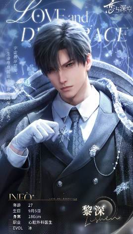 黎深是游戏中一个比较沉稳内敛的男主之一了,而且和黎深的相遇都是靠后面的一些剧情,为什么说黎深特别沉稳,其实也跟黎深自身的职业和年龄有一定的关系,黎深的年龄在游戏中是最年长的27岁,而且在游戏的背景设定下,黎深是一个外科医生,主攻的是心脏,虽然没有绚丽的发色,但是黑色的头发,给人一种非常安稳的感觉,不过黎深这个角色可能是因为职业的问题,在游戏里自身的属性属于冰属性,在战斗中比较擅长使用冰属性来对敌人造成控制效果,同祁煜比较相似的是两个角色都属于辅助类的!