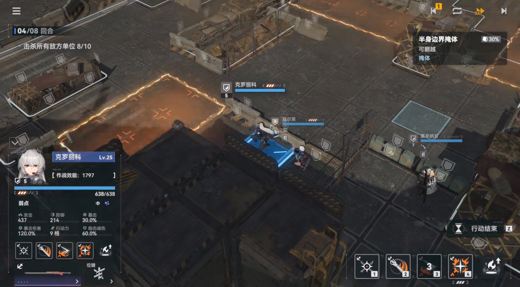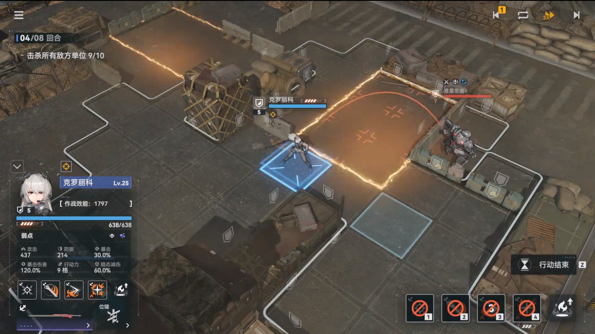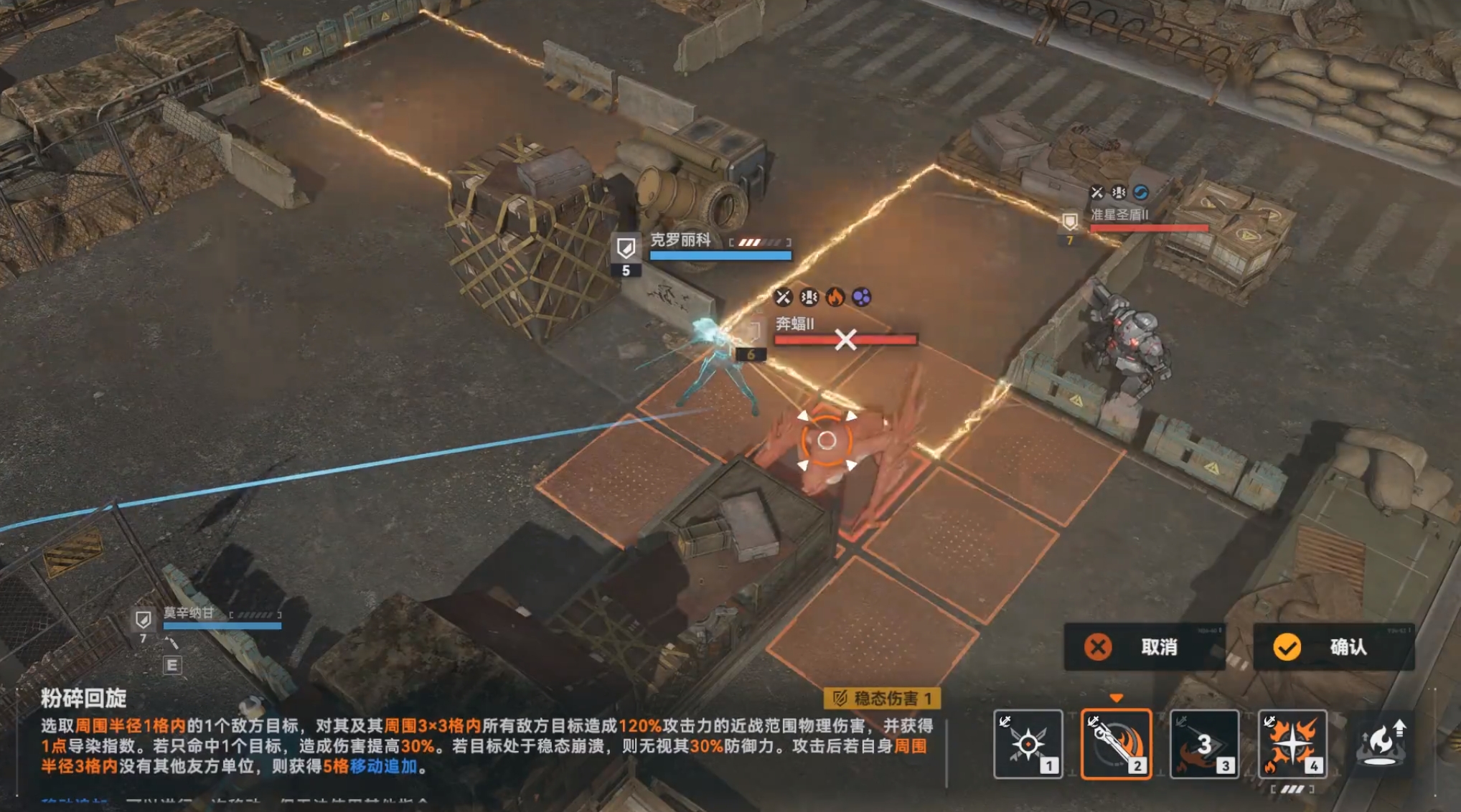 罗丽科是一名可通过溢火打出高额伤害,且自身又能为敌方挂上溢火效果的角色,在技能上既有对单和对群的能力。主动技粉碎回旋可对选择1格内的一名敌人,并以她为中心点,向3*3格内的敌人进行一次群伤攻击,在敌人处于破盾时可无视30%的防御,在练度高时攻击后还能再移动一次,是罗丽科最为常用的攻击手段。