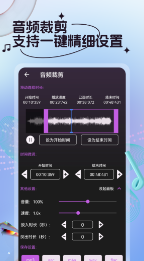 带有多种功能的音频编辑软件,可以手动录入时间点设定裁剪范围,更是能够对片段以及节点的音频进行音量、音调调节,满足了多种不同的制作编辑需求。