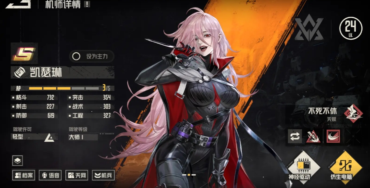 作为格斗家的凯瑟琳也是梯级很高的一位角色,她可以利用轻机兵进行作战,同时天赋中的不死不休还能在自身遭受攻击且无法反击的状态下,自动朝攻击者移动三格,之后还会造成0.4倍的伤害,所以遇上射程远的对手想要偷袭时,凯瑟琳能够起到非常好的反制作用。同时该角色的保命能力也非常出众,一手自我回血的手段让其在持续作战时能有更强的续航表现,同时锁血手段的加持也让其不容易被对手集火秒杀。