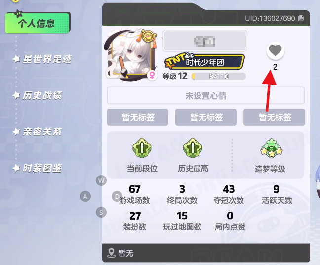 第二中点赞玩法就是需要玩家们点击其他玩家们的资料页面,选择进入个人信息后,选择【星世界足迹】,或者直接在昵称旁边,点击爱心标志!这个点赞的方式主要用于点赞朋友圈,从而增加亲密度!这个设定还是非常有意思的!