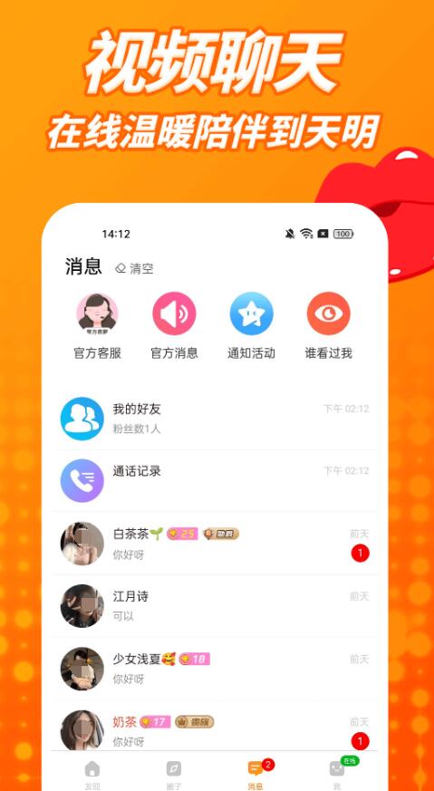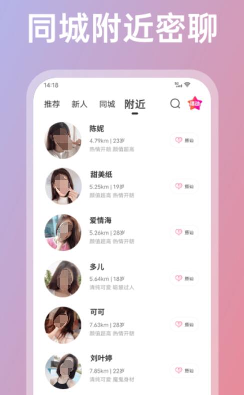 在这个应用的首页,会显示一些高颜值的单身网友,大家可以选择自己感兴趣的,去直接进行交流,无需添加好友,即可畅谈。当你给予了软件定位权限后,还能搜索到附近使用该产品的用户,对其中喜欢的朋友,你可以自动出击,与其进行文字聊天,获得对方同意后,还能面对面视频交流,和对方坦诚相待。